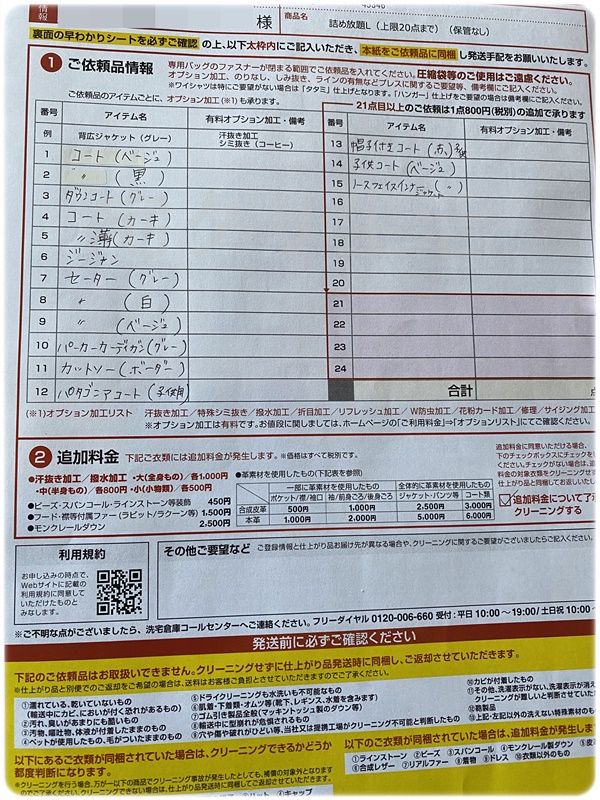 クリーニングに出すものを決めたら、袋に入れながら指定の申込書に品名と、希望の有料オプションを記入します。