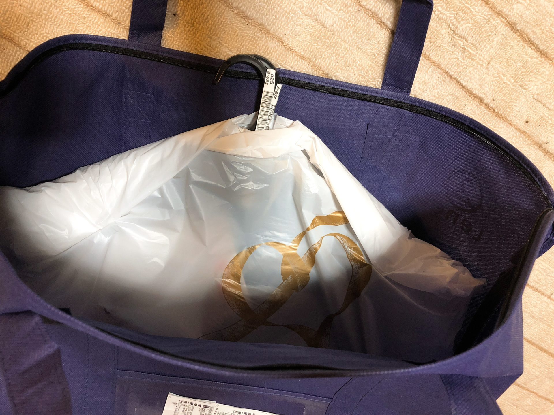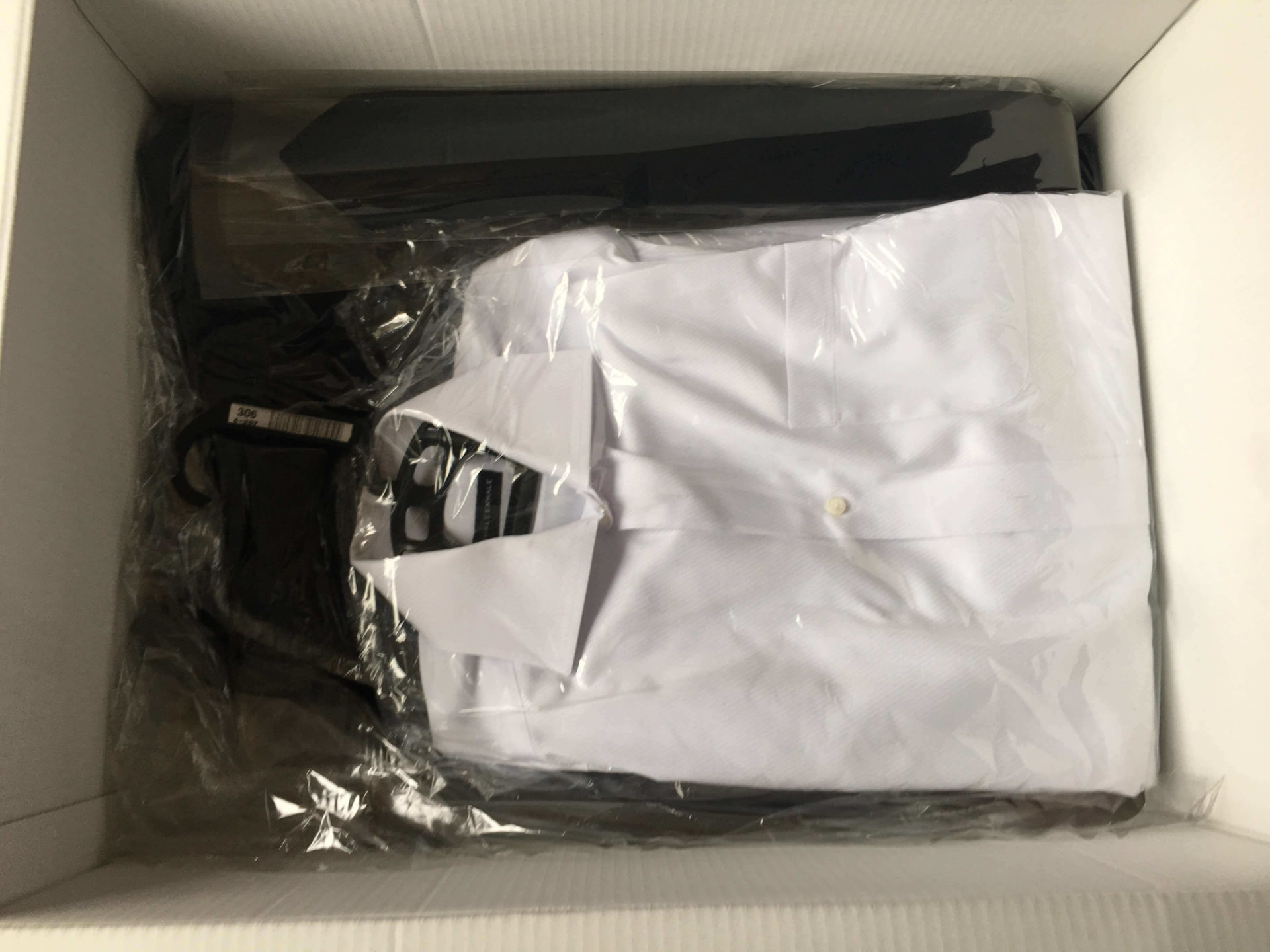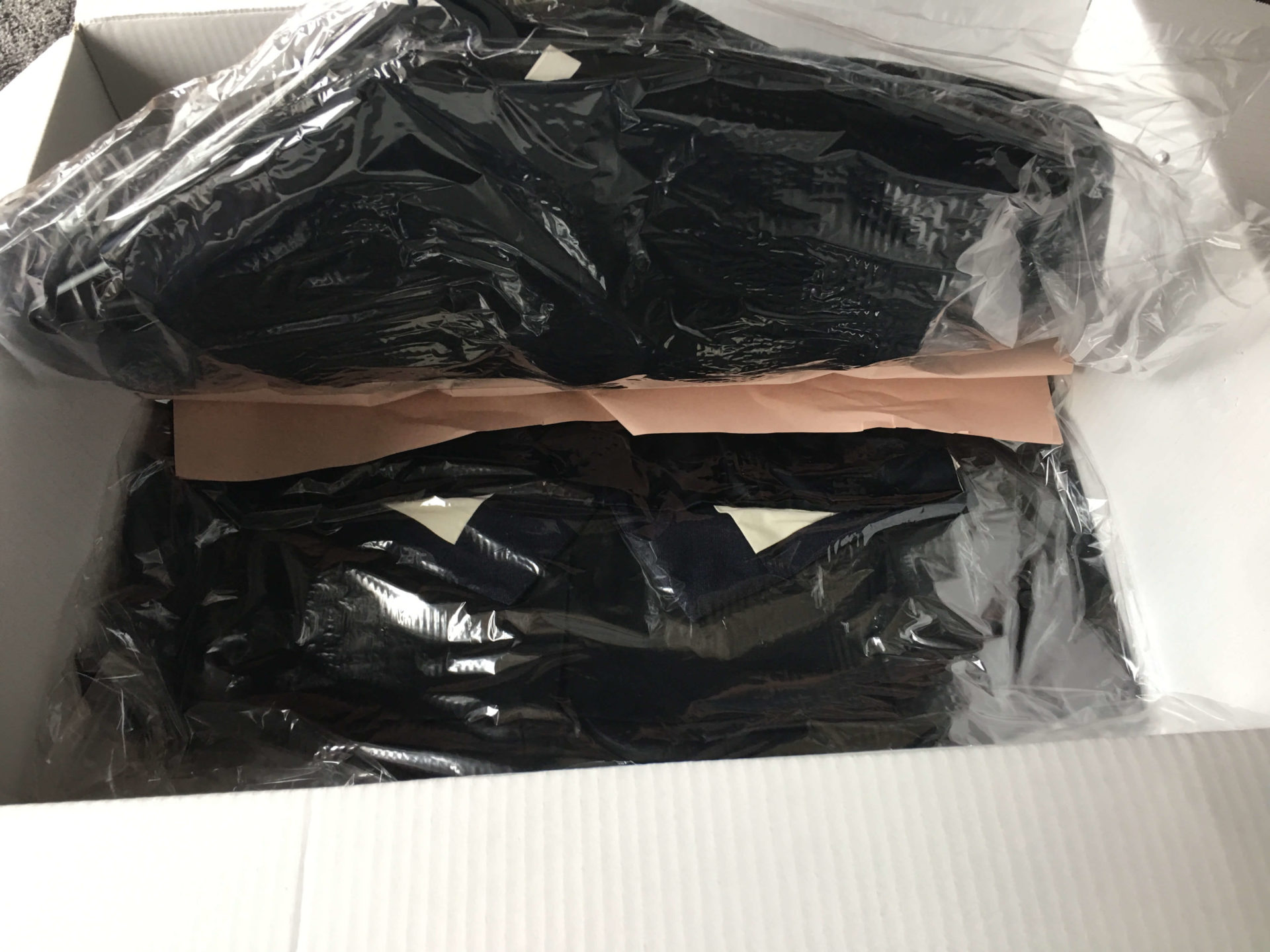 衣類は袋にまとめられ、折りたたんでる部分がシワにならないよう、紙で保護されていました。