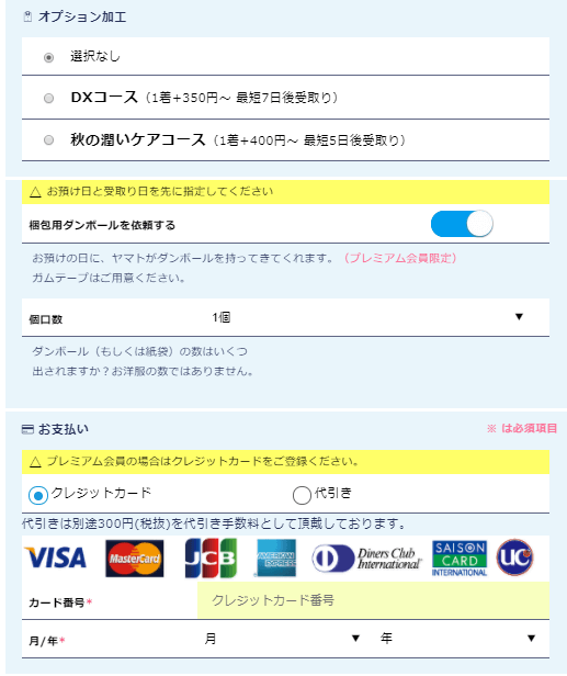 支払方法はクレジットカードと代金引換のみになります。代金引換は手数料が300円加算されます。