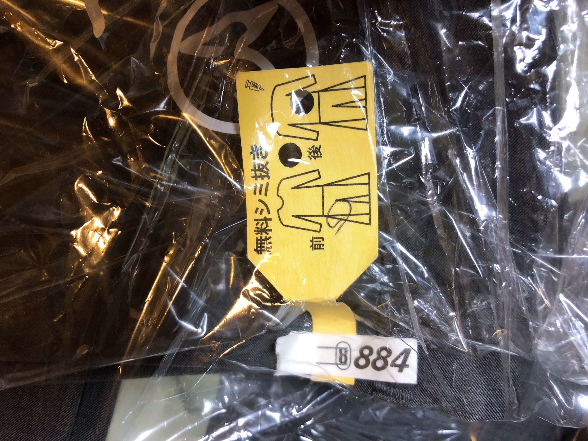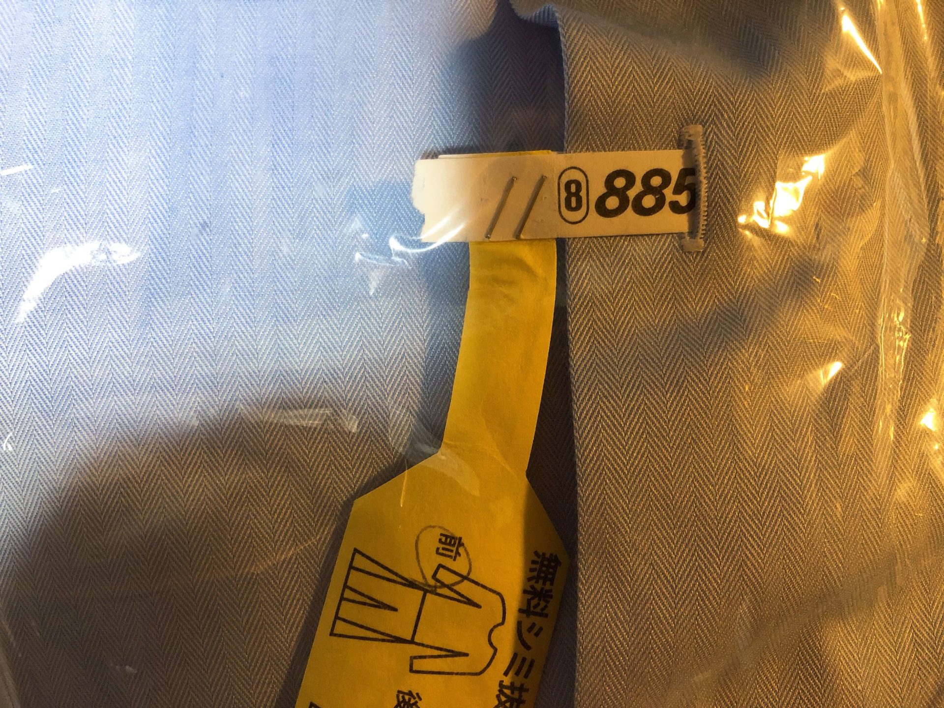 スーツは直接ホッチキスしているように見えますが、ベルトループに白い紙を通し、そこに黄色い紙を付けてホッチキスしてます。