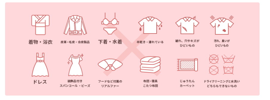 以上の他に、衣類ではないものや、シワ加工・プリーツ加工が施されているものは除外品となります。